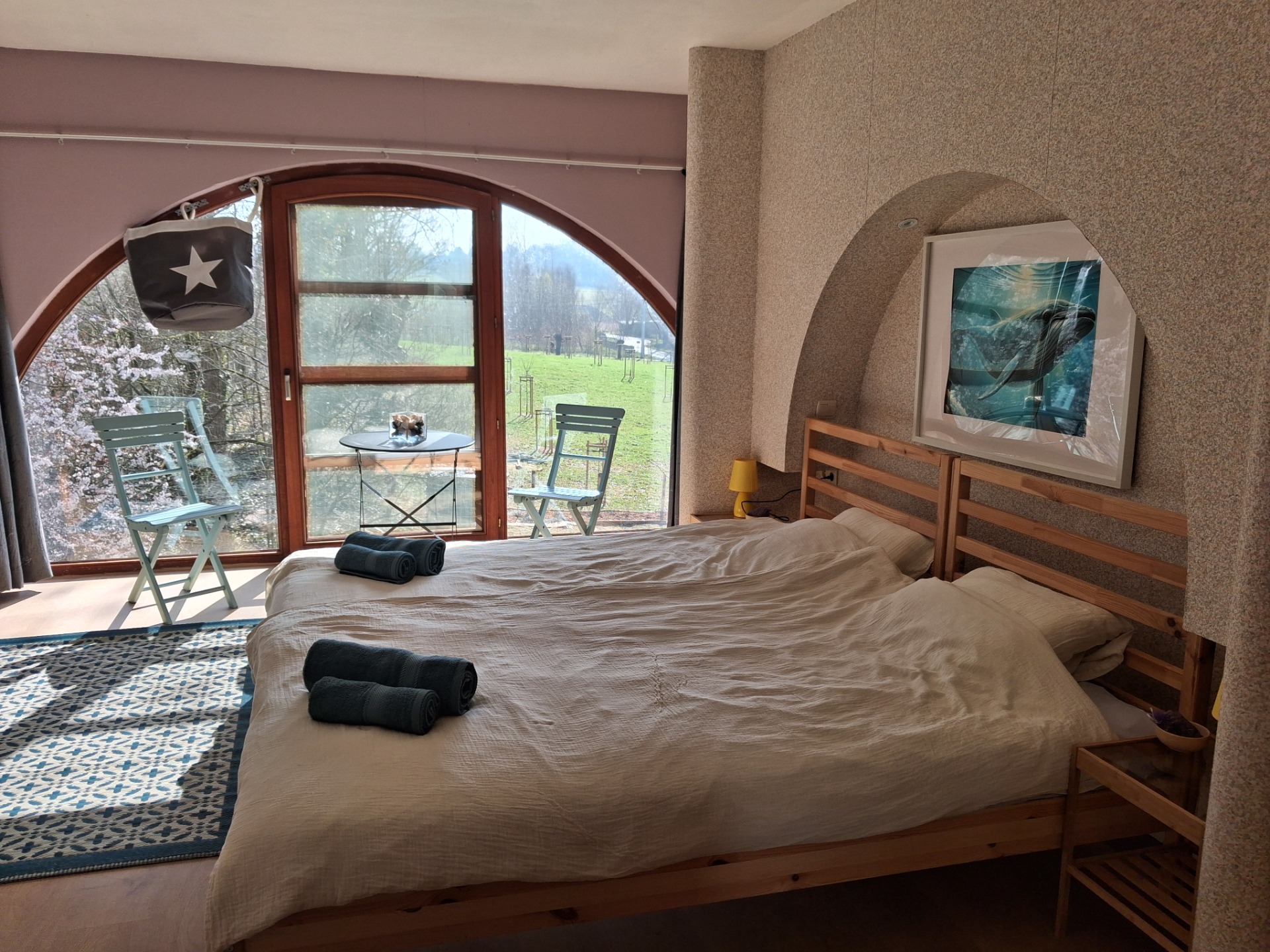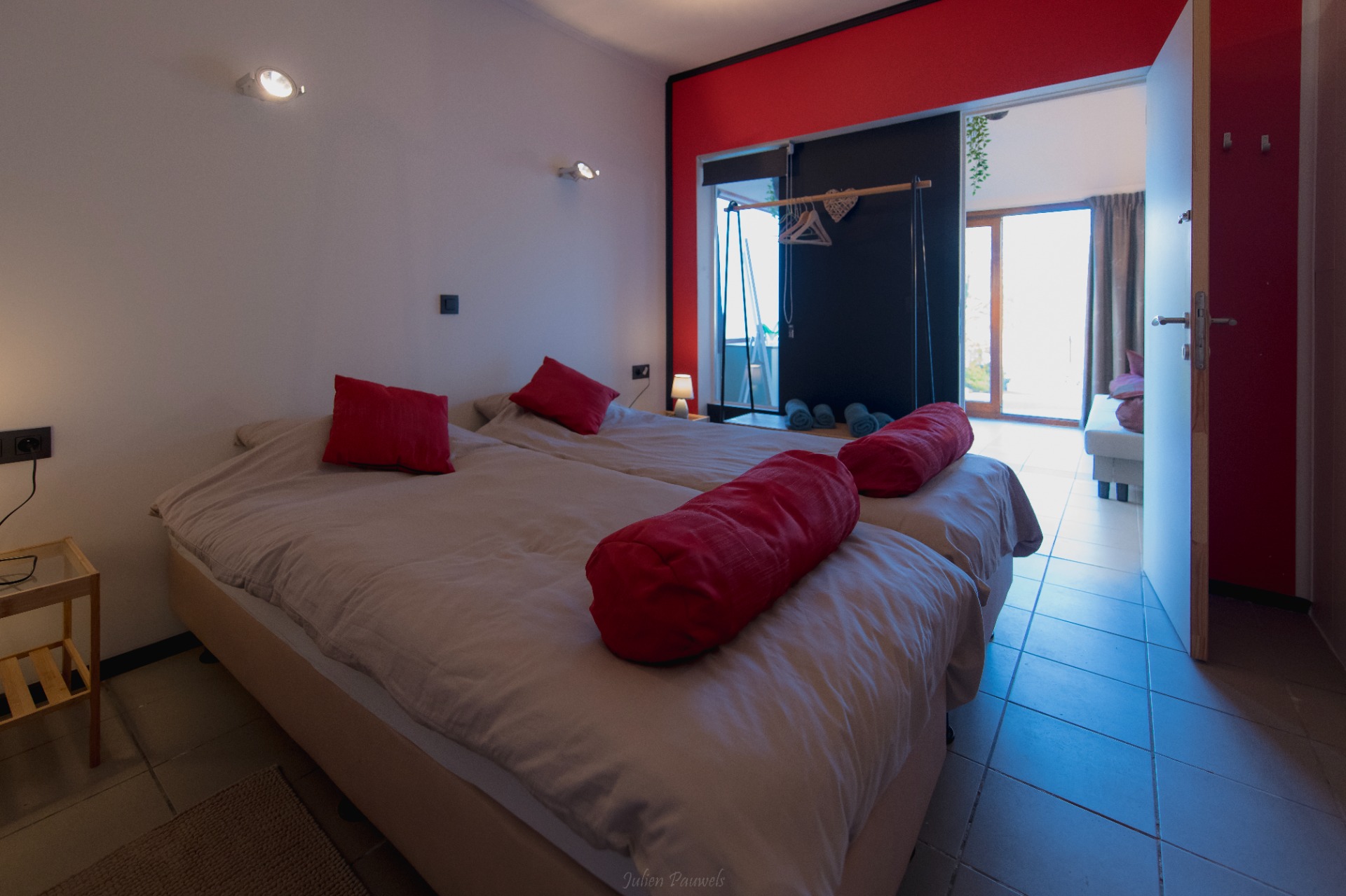 De bedden met bedlinnen kunnen opgemaakt worden als tweepersoons of enkel bed/lit jumeaux en er is een kledingrek om alles op te bergen