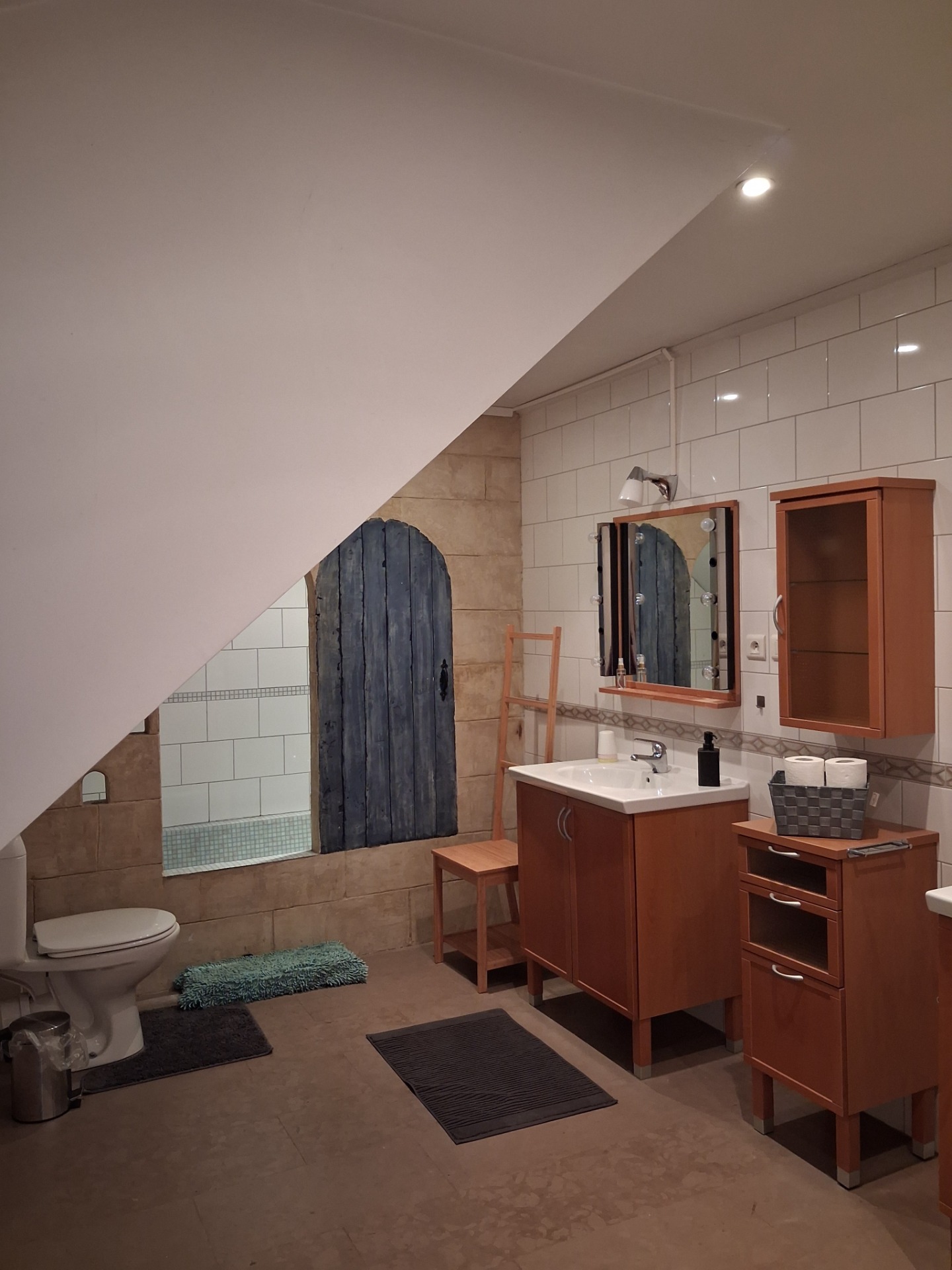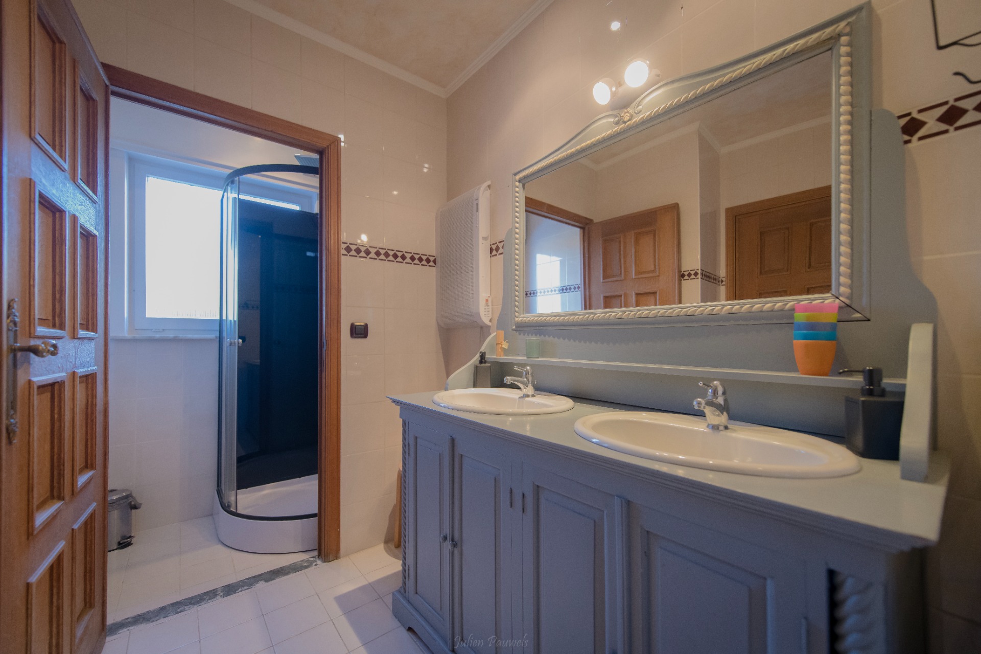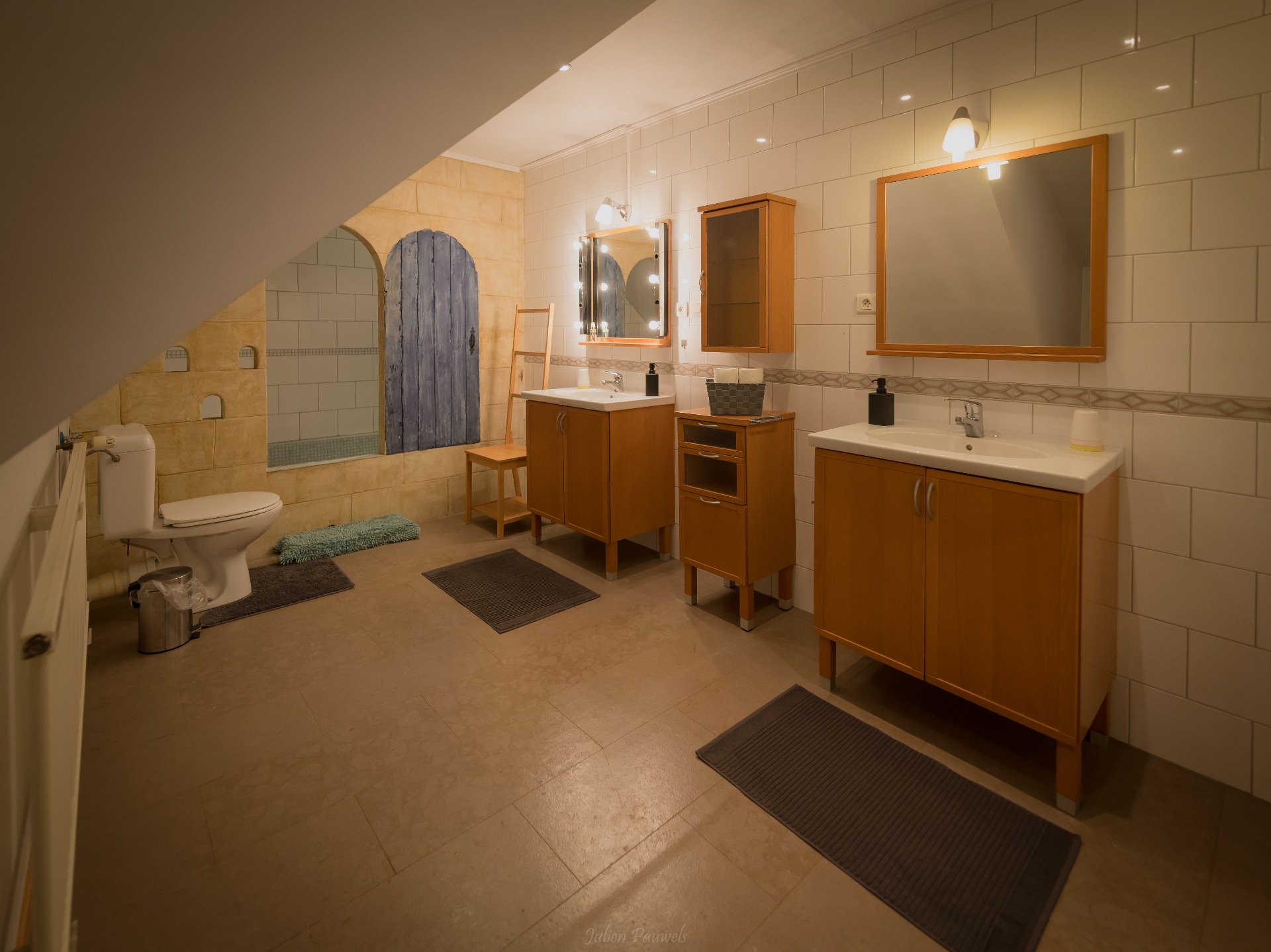 Aansluitend ruime badkamer met 2 wasbekkens, douche en toilet