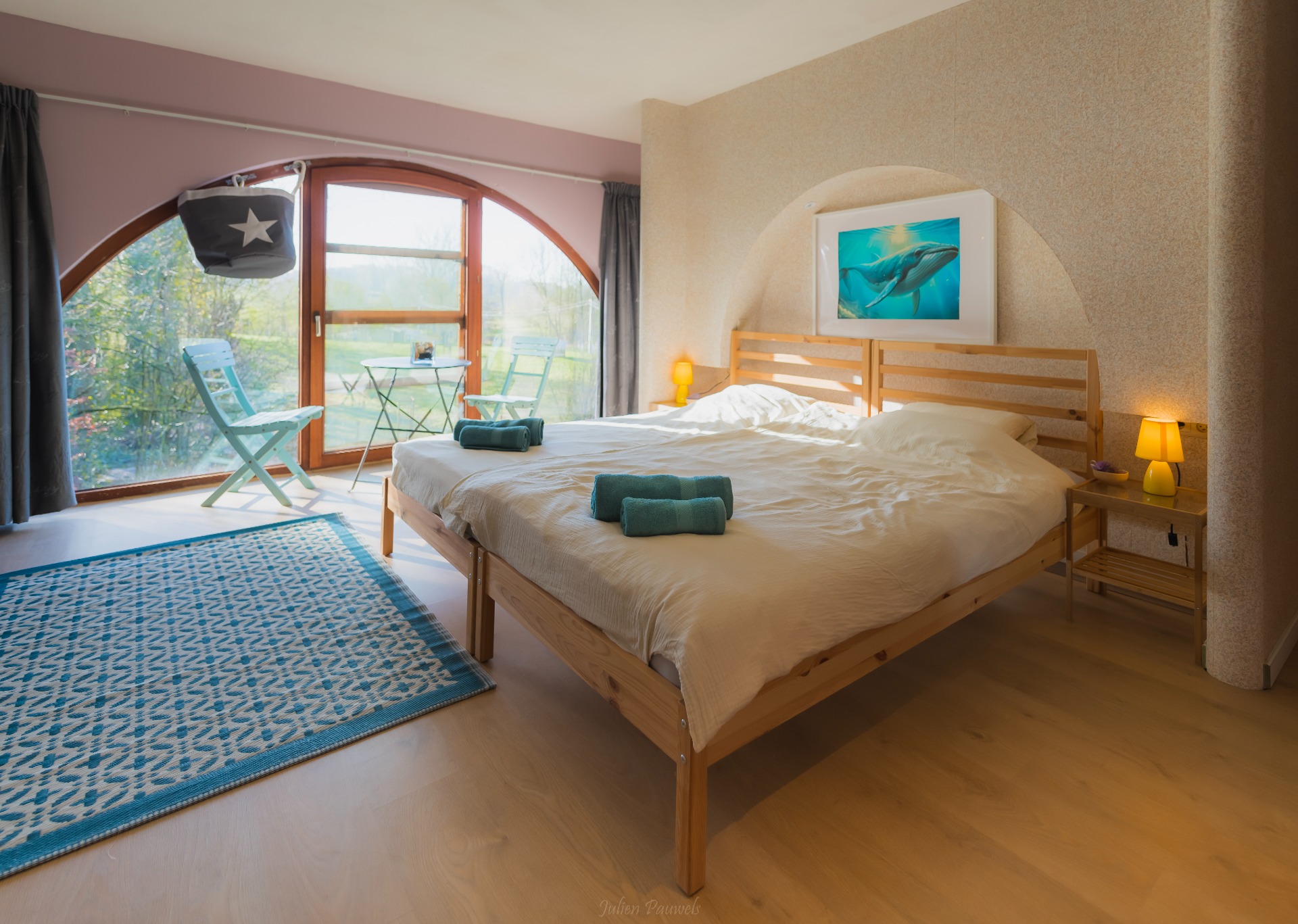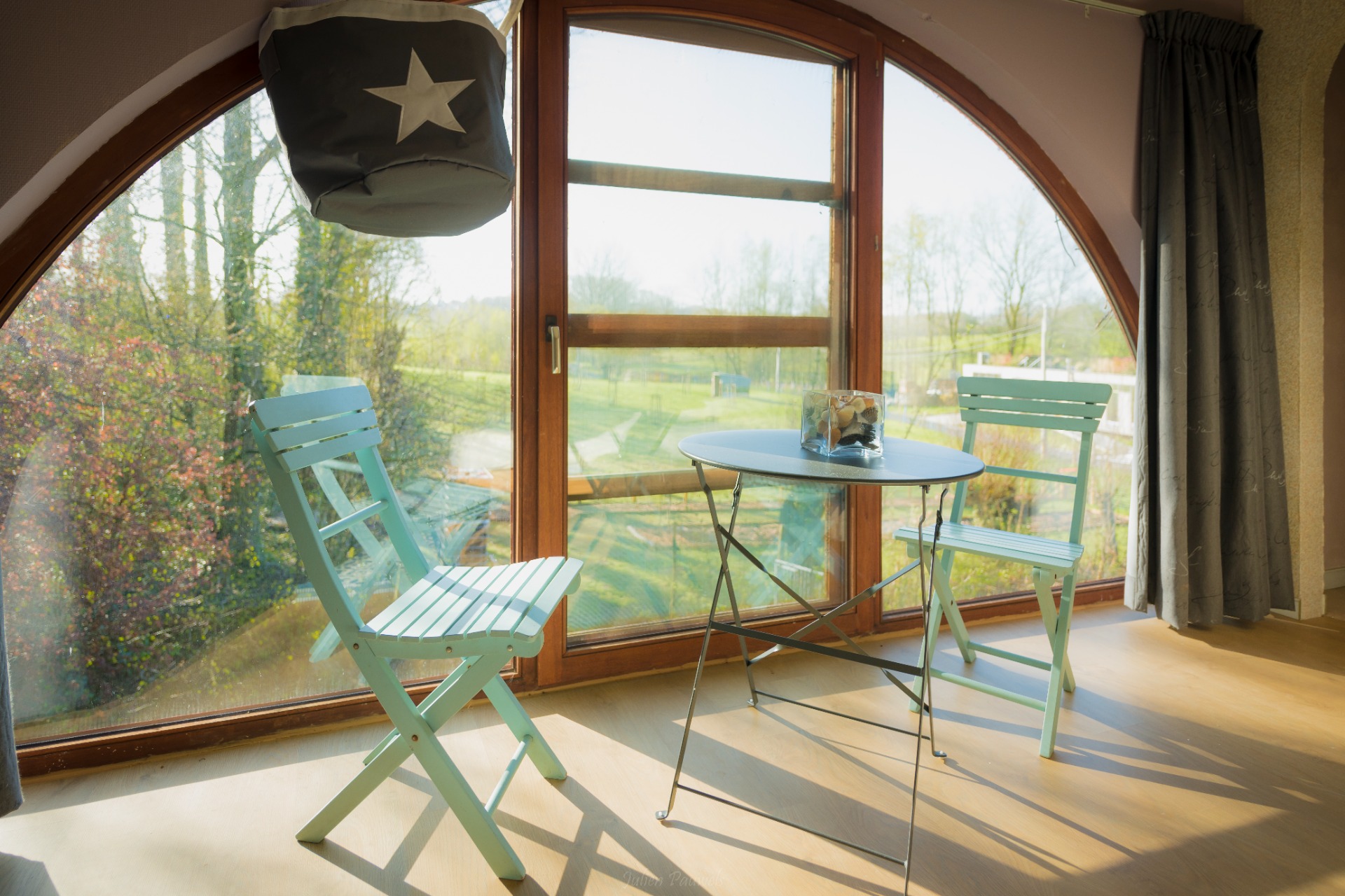 De octopus kamer geeft uit op de binnenkoer met aansluitend de vijver.